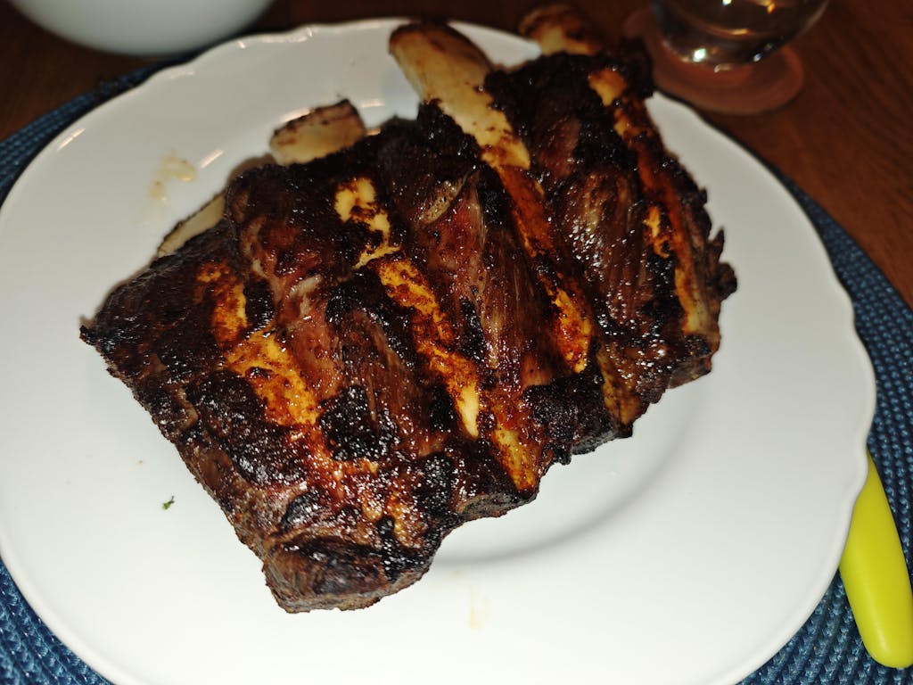 Grill und Glasur: Heizen Sie den Grill auf mittlere Hitze vor. Nehmen Sie die Ribs aus der Folie und legen Sie sie für ca. 1 Stunde auf den Grill. Während dieser Zeit die Ribs regelmäßig mit einer BBQ-Sauce und Ahornsirup-Mischung (60/40) glasieren, um eine schöne, klebrige Kruste zu erhalten.
