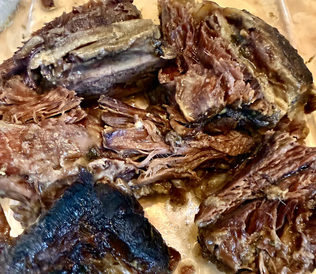 • Den Beef Hammer in eine feuerfeste Form legen, etwas Brühe angießen und locker mit Alufolie abdecken. 5–6 Stunden schmoren, bis das Fleisch butterzart ist.