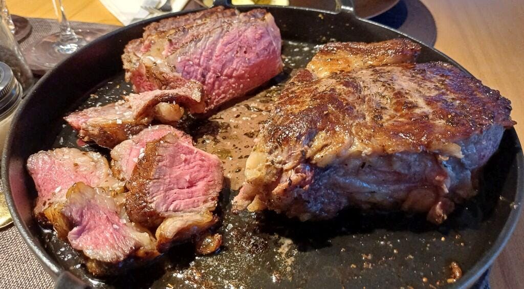 Erhitze eine Pfanne auf hoher Stufe, bis sie richtig heiß ist. Verwende unbedingt ein geeignetes Fett zum Anbraten. Unsere selbst hergestellte Beef Butter jetzt kaufen ist perfekt dafür geeignet, da sie für das scharfe Anbraten ideal ist und dem Steak zusätzlichen Geschmack verleiht. Brate das Steak auf jeder Seite sehr scharf an, bis es durchgehend braun ist. Wichtig: Das Steak nur einmal wenden!