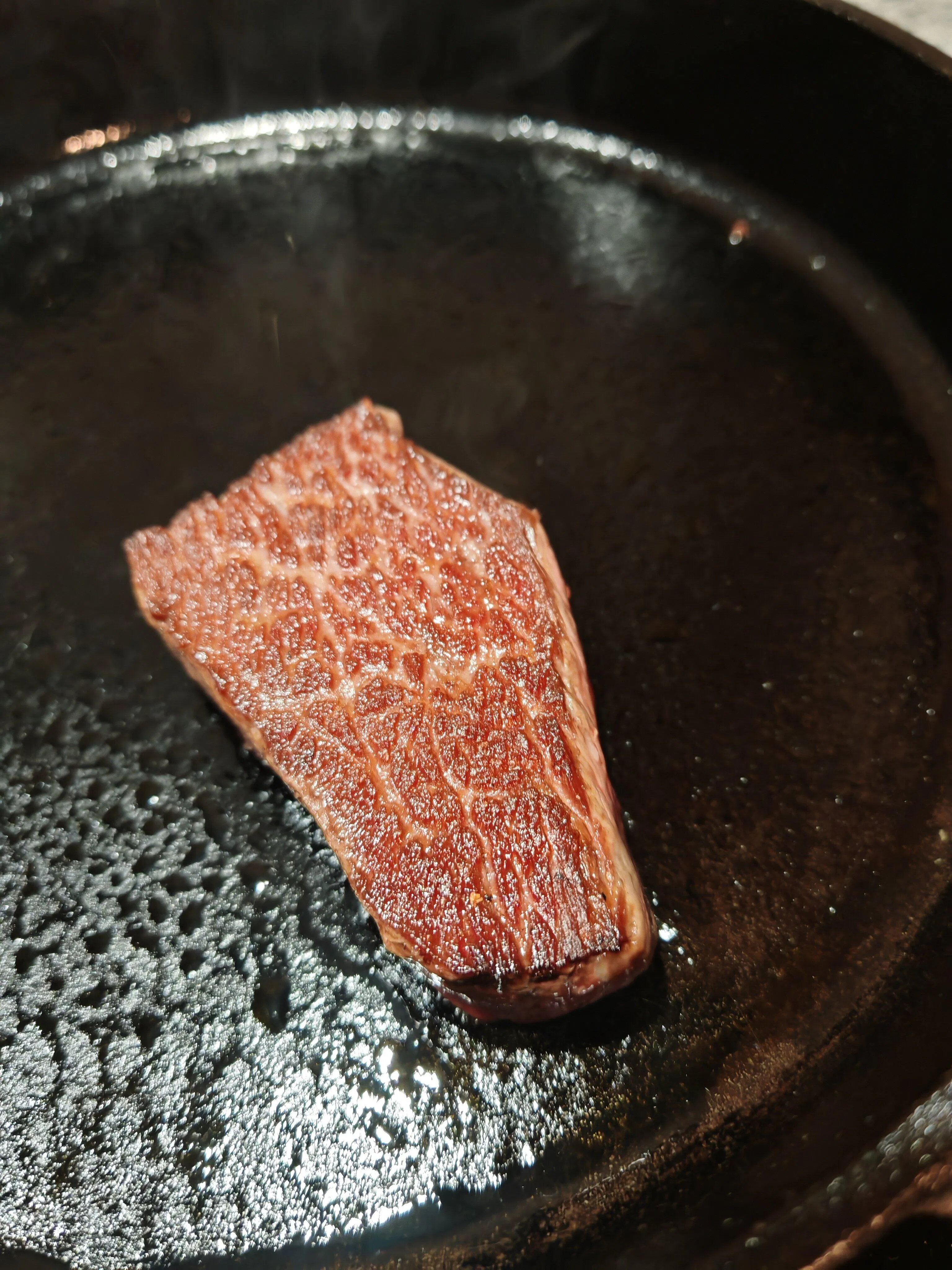 Hatte das Wagyu-Bavette bereits mehrere Male, dieses Mal war es leider keine gute Qualität, sehr viel "hartes" Fett/Sehnen. Die Hälfte vom Fleisch gab beim Drücken/Berühren nicht nach sondern blieb fest = war nicht zart.