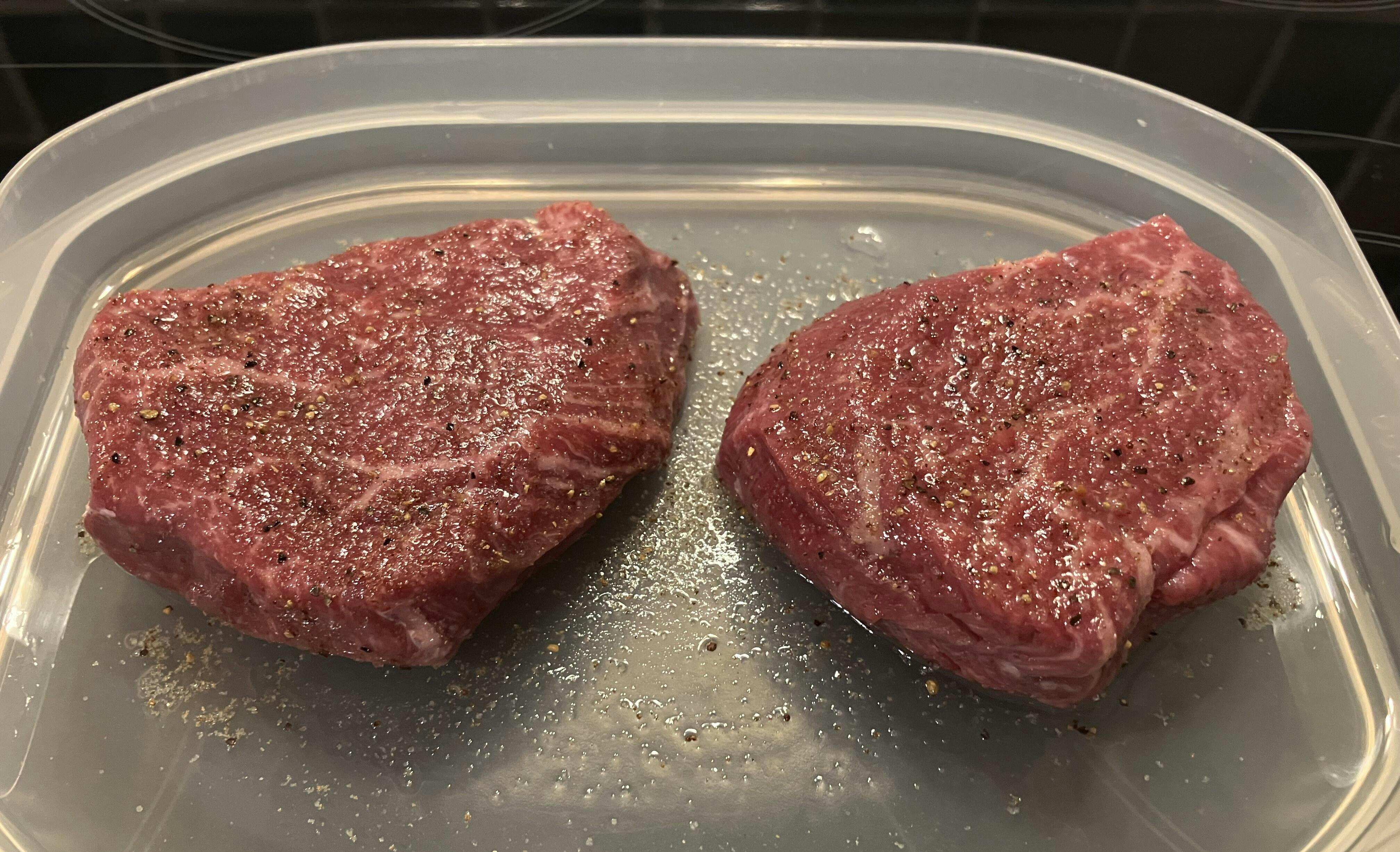 Nimm das Wagyu-Steak aus dem Vakuum und salze es leicht von beiden Seiten. Ofen auf 110°C vorheizen.