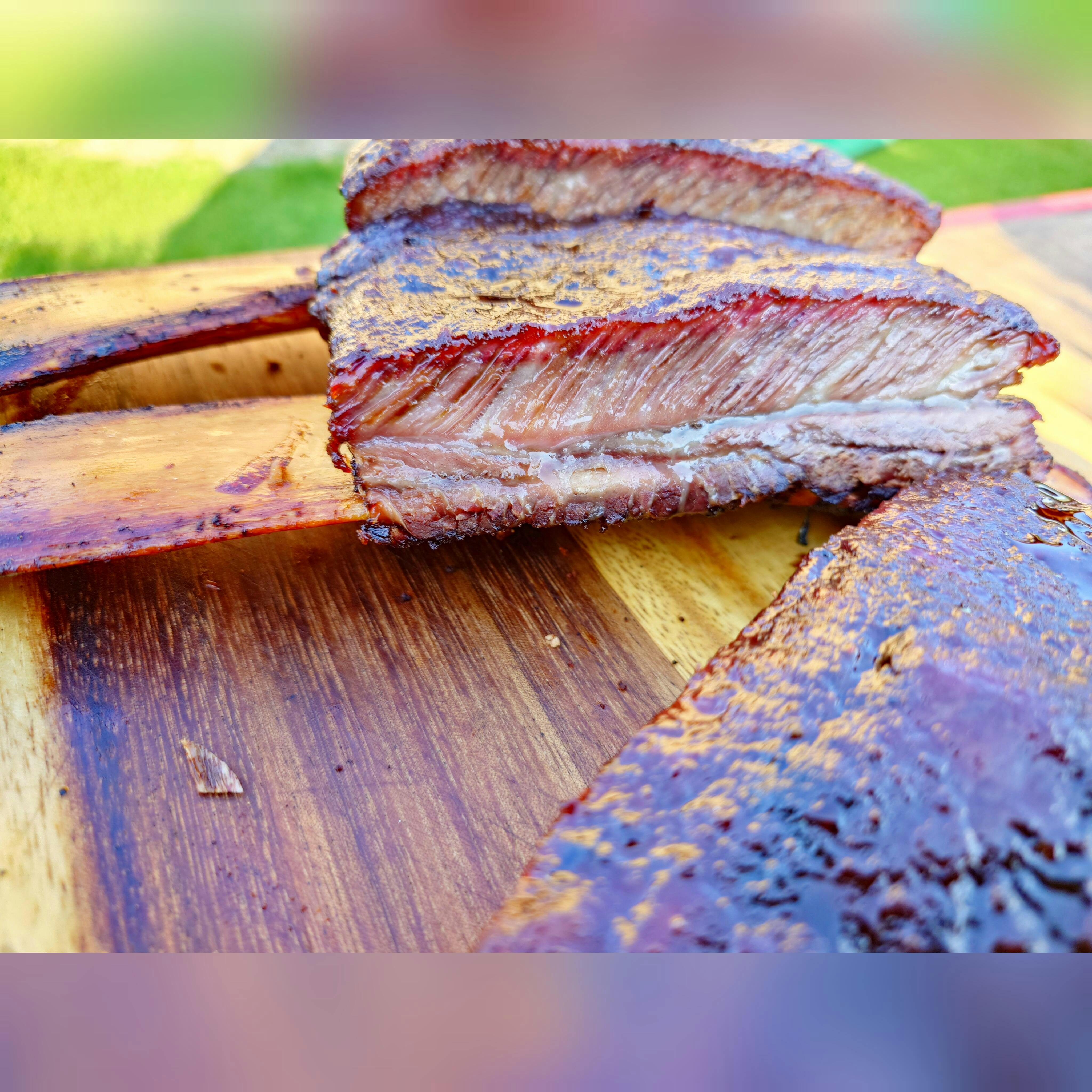 Zuerst die Silberhaut entfernen und die Short Ribs mit ein wenig Ahornsirup einpinseln und im gewünschten Rub einreiben. Die Short-Ribs am besten vakuumieren und mindestens 30 Minuten einziehen lassen. Anschließend auf den vorgeheizten Grill legen, Fleischthermometer einstechen und geschlossen bei 130 °C garen lassen. Sobald die Kerntemperatur des Fleisches 90 °C erreicht hat, sind die Short Ribs am Ziel angekommen und müssen danach nur ein paar Minuten ziehen.